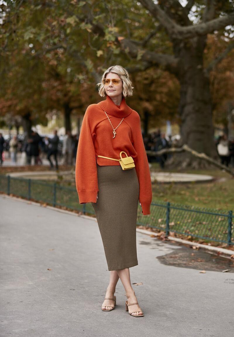 在秋天,针织衫与半身裙的搭配也是十分常见的了,这样的搭配往往会给人十分温柔的淑女气质。